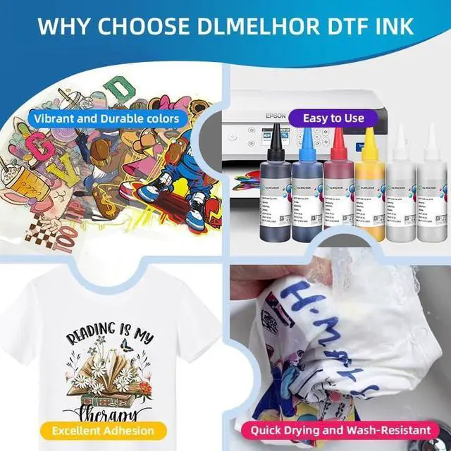 DTF ink Package Include: 6x100ml DTF Transfer Ink Conversion Kit Refill(White x 2, Black x 1, Cyan x 1, Magenta x 1, Yellow x 1)DTF Transfer Ink for PET Film.printers. Meet your printing needs.
