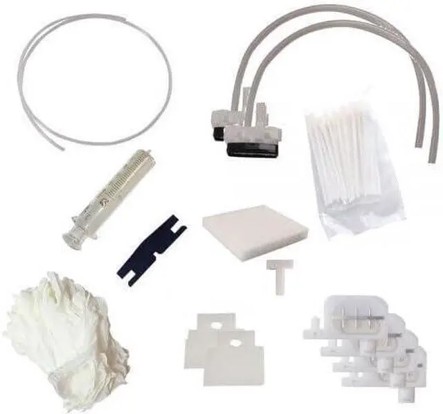 This Maintenance Kit contains: - 50 Clean Swabs - 2 Wiper Blades - 4 Small Dampers - 1 Meter Tube (2mm x 3mm) - 1 Syringe 50ml - 2 Cap Tops - 1 Sponge - 1 Scraper for Wiper - 10 Latex Gloves -1 serge mist