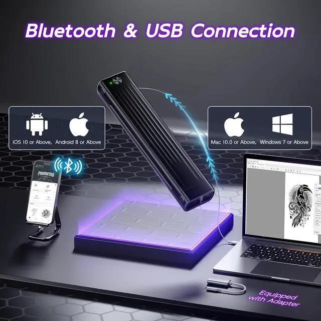 Wireless Tattoo Printer with High CompatibilityItari tattoo stencil printer is compatible with both phones tablets and laptops. Phones and tablets support Bluetooth connectivity, connect and print in two minutes. Laptops must be connected via a USB Type-C cable. This tattoo transfer printer also supports a wide range of operating systems, including Android, iOS, Windows 7 or above, macOS 10 or above. (Note: Using laptop you must go to tp86.phomemo.com to download the driver in order to print)