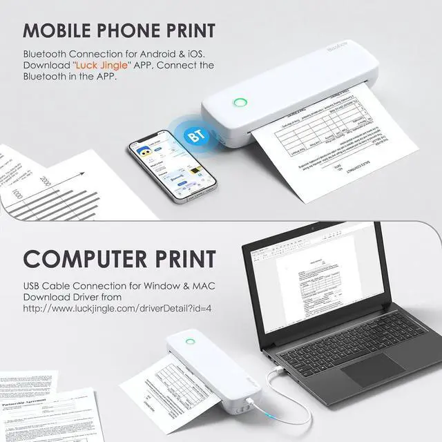 Flexible Connectivity: This printer supports both wireless and wired connections. You can connect it to your mobile device via Bt and use the -Luck Jingle- app available on the App Store (iOS) or Play (Android). It can also be connected to a PC or computer with USB cable for printing.