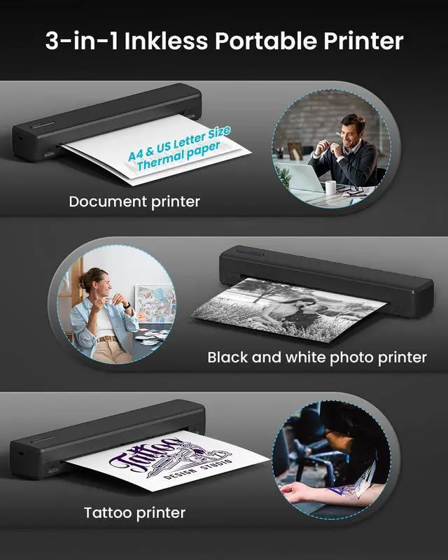 Multi-Use & Kit ConfigurationThe Bluetooth tattoo stencil printer is also an excellent portable printer wireless for travel.Whether for work,home,outdoor activities, or travel,it provides convenient,on-the-go printing,helping you efficiently handle tasks.The tattoo transfer printer kit includes:1 x tattoo transfer printer,10 x tattoo transfer paper,10 x US Letter thermal paper,1 x charging cable,1 x user manual,1 x packaging box,1 x soft storage bag.