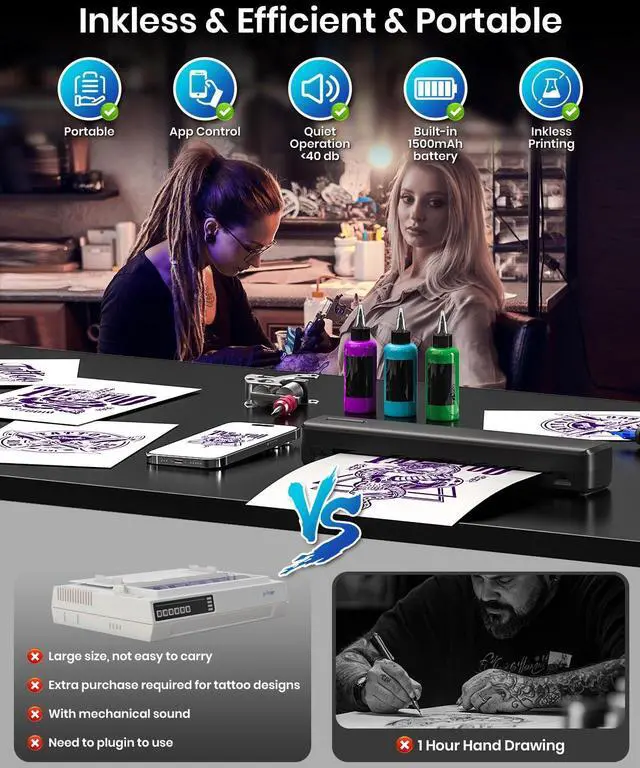 Portable & Rechargeable & WirelessThis tattoo stencil printer kit is perfect for both beginners and professionals. The thermal tattoo printer is lightweight, wireless, and rechargeable. Weighing only 1.1 lbs, its 45% lighter than other portable tattoo printer machines. With a 1500mAh battery, it ensures long-lasting performance, ideal for mobile tattoo artists needing a reliable tattoo stencil printer on the go