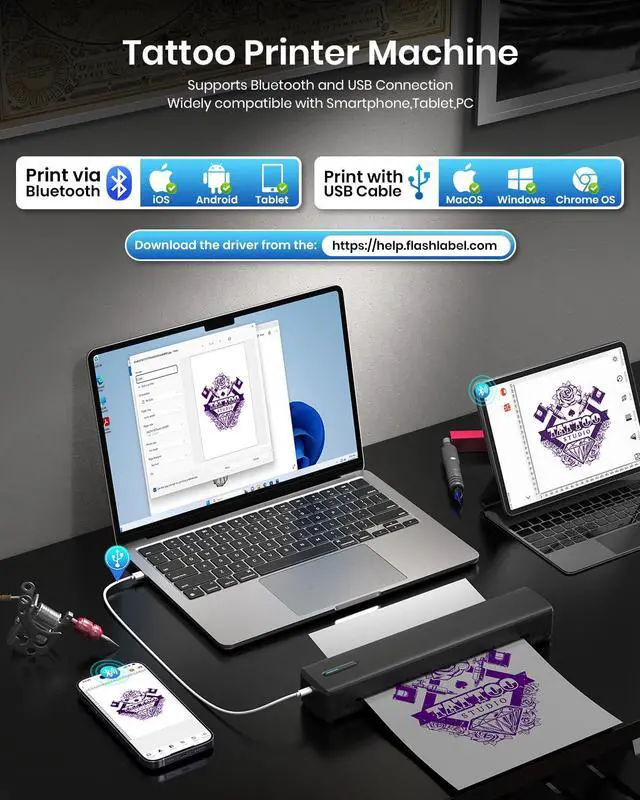 Wide Compatibility: The stencil printer for tattooing works seamlessly with Android and iOS devices (phones & tablets) via Bluetooth. For PC devices, it supports Windows and macOS but requires a wired connection. Note: Bluetooth is not supported for PC use, and a driver must be downloaded. This portable thermal printer supports thermal fold paper, thermal roll paper, as well as US Letter, Legal, and A4 sizes. Thermal paper width is limited to 210-216mm.