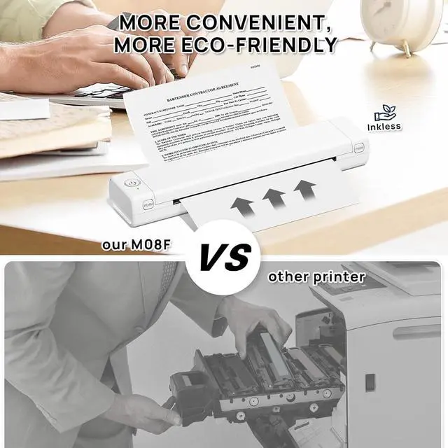 Portable & Compact Printer - Our M08F letter small portable printer weighs only 1.57lb and 1.6in thick, able to fit in a bag or briefcase for easy carrying. And the inkless printer is very sturdy and not easy to be damaged, it is a mobile printers for vehicles, can be used for on the go, business, office, home, school when you need to print something quickly.
