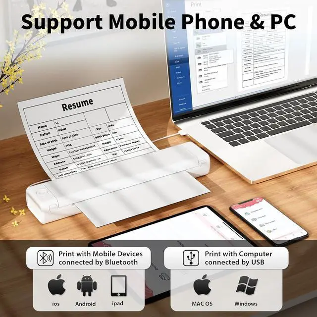 Easy to Use - M08F inkless portable printer for phone & laptop compatible with Android and Ios, by BT connection, select the M08F printer within the app to complete the pairing, but also through the USB-C cable, printing on Mac and Windows system (PC requires driver download).