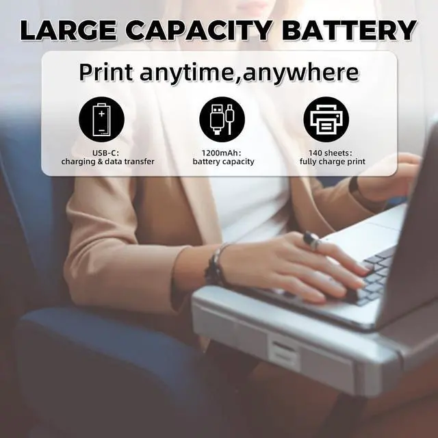 Large Capacity Battery - The travel printer is rechargeable, built-in 1200mAh lithium battery, when fully charged can continuously print 140 sheets of 8.5" X 11" US Letter thermal paper. Long battery life, equivalent to 20 hours of continuous use.TYPE-C port for charging.