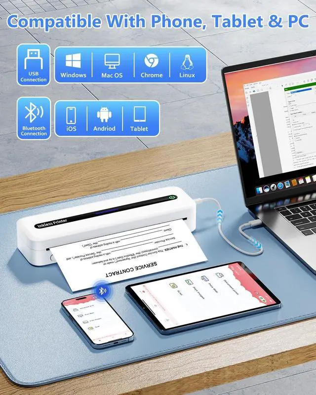 High Compatibility, Convenient Connection - Setting up the Itari M832 travel printer is a breeze. With its Bluetooth connectivity, you can easily connect it to your iOS or Android phone by installing the "Phomemo" app. Simply choose the right paper type, and you're ready to print your documents or pictures. Additionally, you can also connect the thermal printer to your Windows, Mac, Linux laptop using USB cables. (PC devices only work with a USB connection, need to download the driver first: m832.phomemo.com )