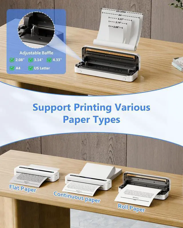 Print in 5 Different Sizes, Quality Printing - Itari M832 mobile printer supports 5 different thermal paper size (2.08'', 3.14'', 4.33'', A4 and 8.5''x 11'' US Letter) and delivers high-resolution printing (up to 300dpi), ensuring clear text and sharp graphics. Perfect for documents, receipts, invoices, notes, photos, checklists, agreements,etc. You don't need to carry paper respectively, as this M832 bluetooth printer supports roll paper, which alleviates having to carry the printer paper with you.
