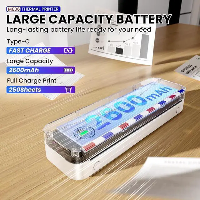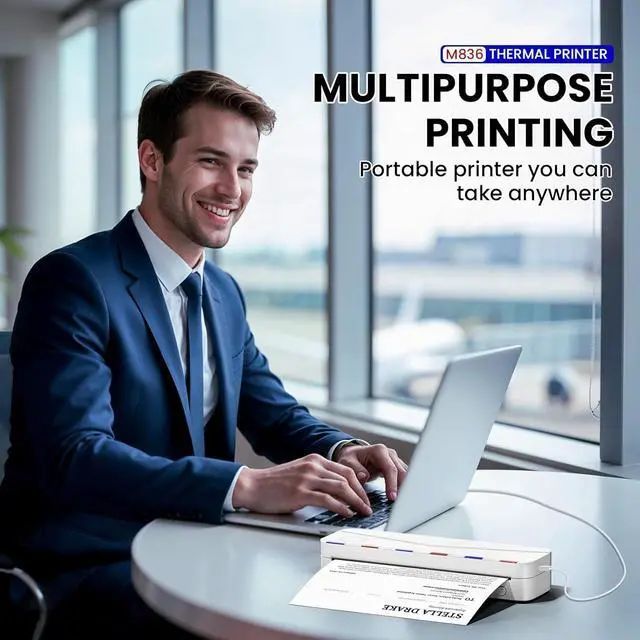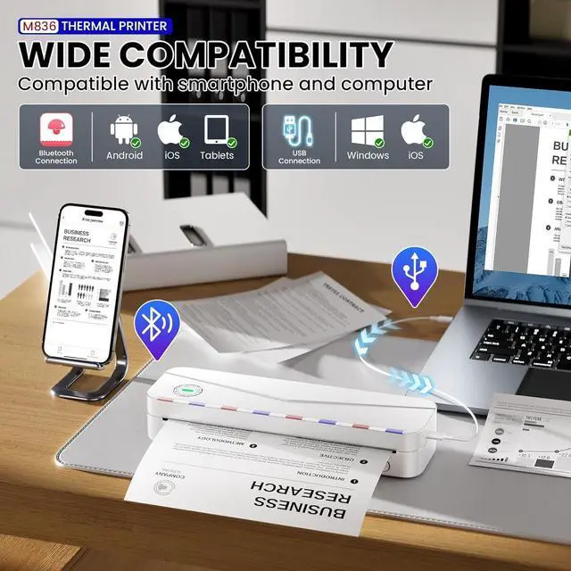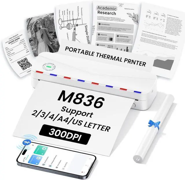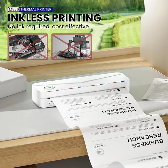 Inkless Printer - M836 wireless portable printer uses advanced thermal printing technology, Don't require ink, toner, no ink-related blockages, and cleaning issues. NOTE: This Inkless printer is only supports thermal printing paper, not support regular copy paper