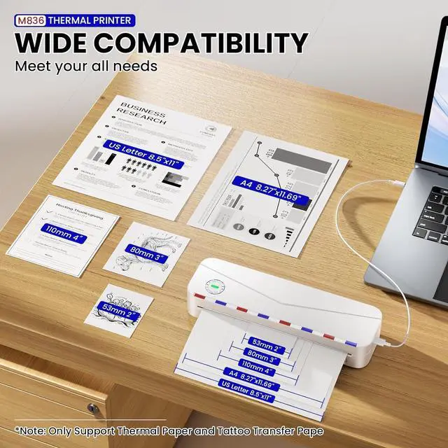 Phomemo 2025 Upgrade Portable Printer - M836 Thermal printers can support multiple thermal paper sizes - US Letter 8.5" x 11" & A4 8.27" x 11.69" thermal paper, 2" & 3" & 4" (width 53/80/110 mm). The inkless portable printer can also support 3 paper types, thermal standard paper sheets, roll paper and folded thermal paper