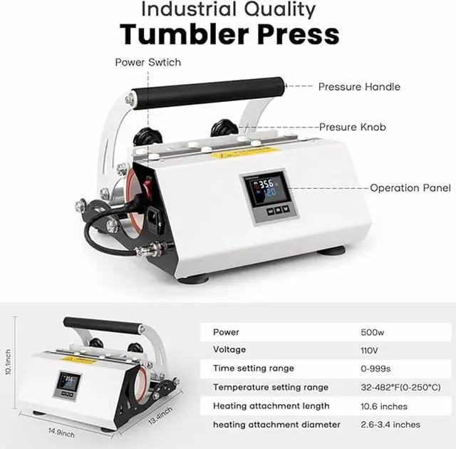 Mug Heat PressThe mug heat press is equipped with a detachable heating attachment, with a length of 10.6 inches (27 cm) and a diameter range of 2.6-3.4 inches. This mug press is versatile and can be used to personalize mugs.