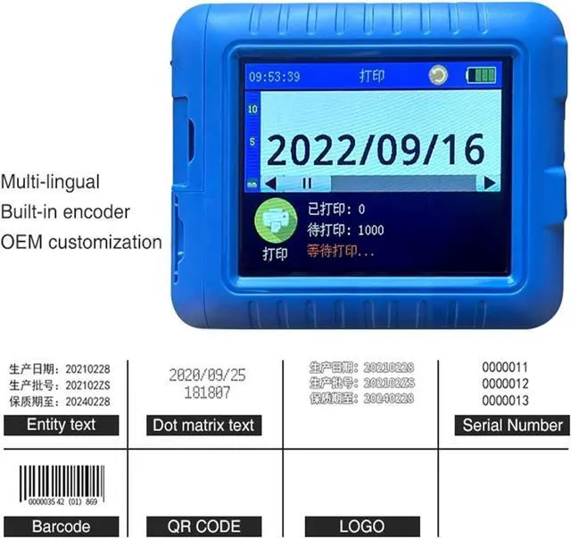 2. Support external font import, add the function of USB socket, and fully surround the protective cover of the ink cartridge of the machine.Can print date, time, text, serial number, picture, barcode, two-dimensional code, variable two-dimensional code, etc