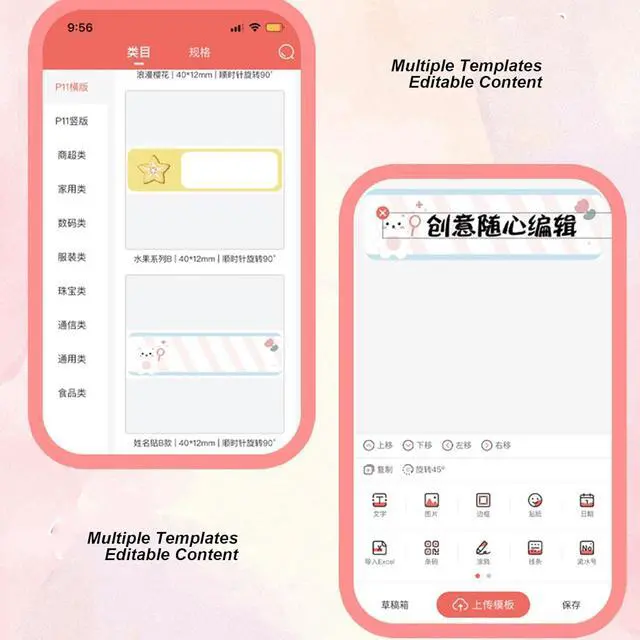 Multiple Templates: There are multiple label templates in the app used by this label printer and it can also print a variety of text, numbers, graphics, symbols, logos and borders.