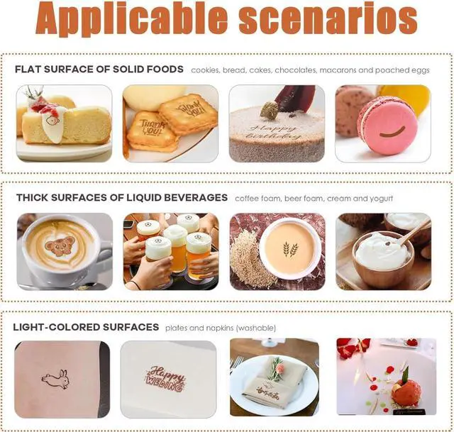 Wide Use: It can print on the following food surfaces: solids: cookies, breads, cakes, chocolate chips, rice and omelettes that don't come into direct contact with water, as well as light-colored flat objects. Suitable for personalized printing of small quantities of food. for restaurants, bakeries, cafes, bars and other venues.