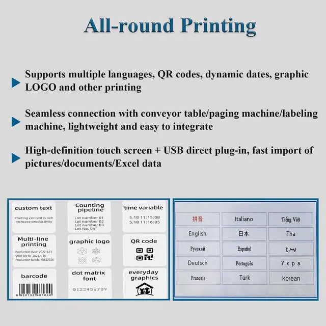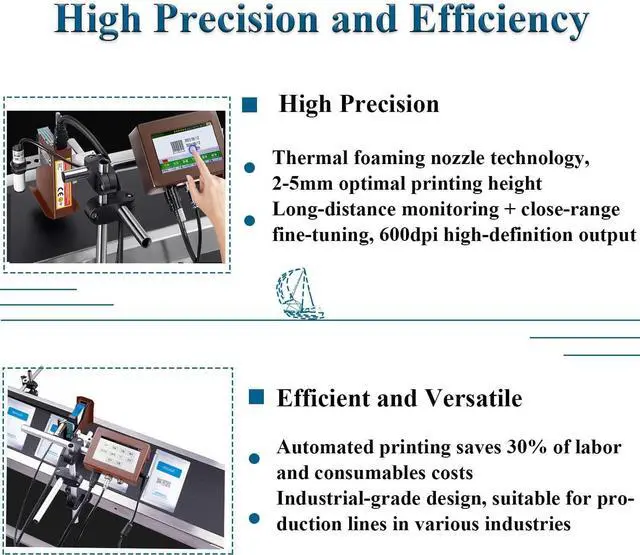 HIGH-DEFINITION RESOLUTION: The online inkjet printer has a stable output with a clarity of more than 300DPI, supports USB/U disk import, is equipped with multiple interfaces, and has a printing speed of up to 30 meters/minute.
