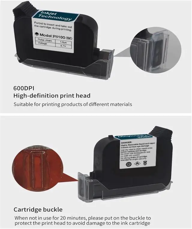 1. Our ink cartridge boasts a fast-dry solvent ink, ensuring clear prints on various surfaces including boards, carton, stone, pipe, cable, metal, plastic, and electronics