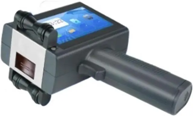 The printer's compact print head produces 2D codes, enabling direct part marking on curved surfaces such as bottles and industrial components