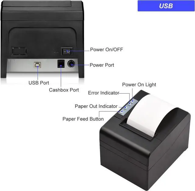 pting thermal print head, no need of ink cartridges or ribbons, clear printing, low operation cost, thermal paper is easy to buy. And with auto cuter, which is easier to take off the receipt paper.