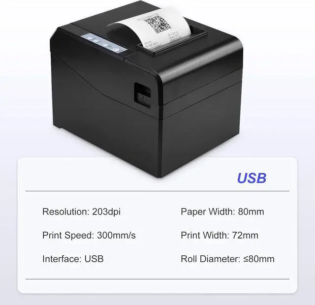 Portable desktop thermal receipt printer, 80mm paper width, 72mm print width, and support 80mm paper roll diameter, 203dpi resolution. Clear printing quali and reliable performance.