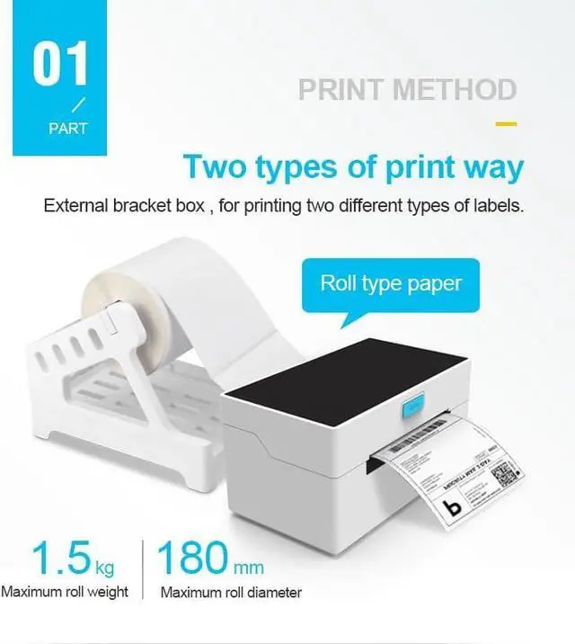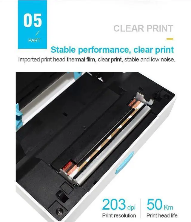 High Performance PrintingSupported by 160mm/s high- printing technology, it can print one paper one second, saving 2-3 hours per day. The resolution of 203DPI, giving you an efficient and high-definition printing experience. The label printer has an ligent scopic function t automatically adjusts the label position accurately. Portable and attractive made of high-quali s, label printer is durable and could be used for a long time which has 50km head life.