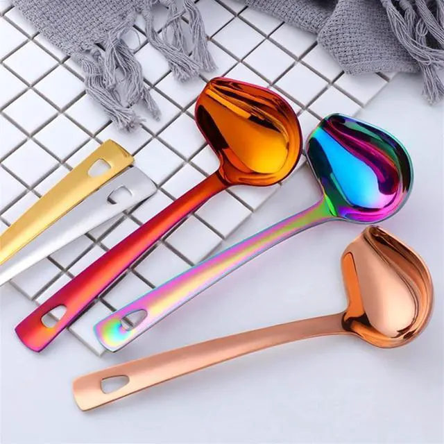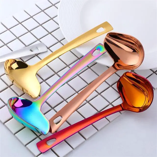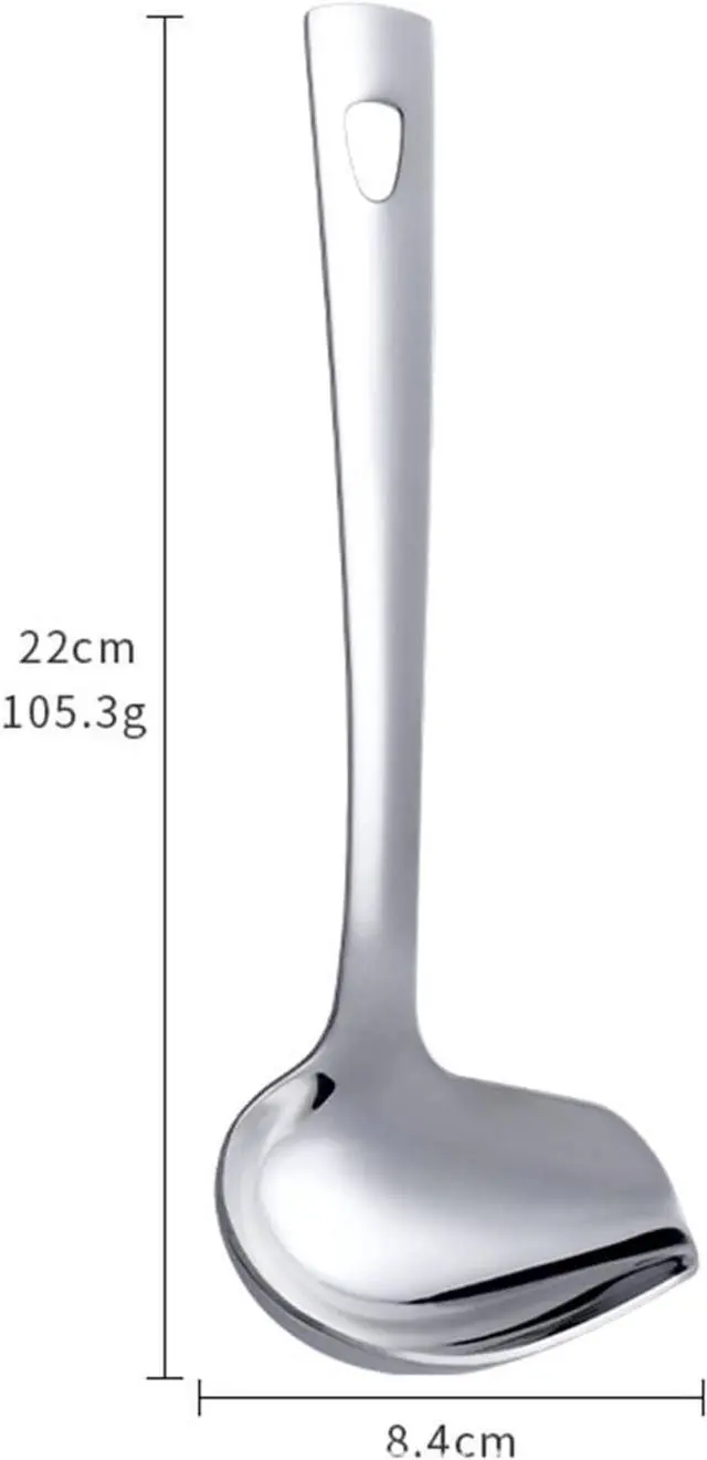 Has a long handle, a deep spoon basin and a front gravy pouring port.