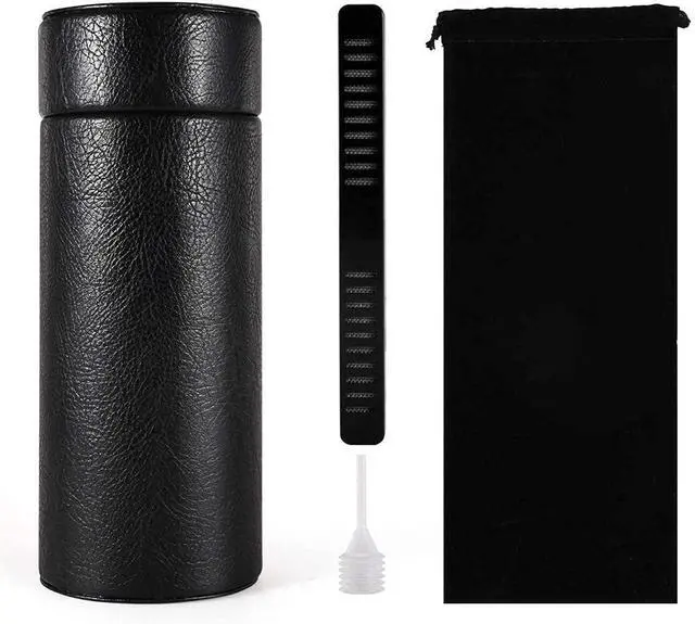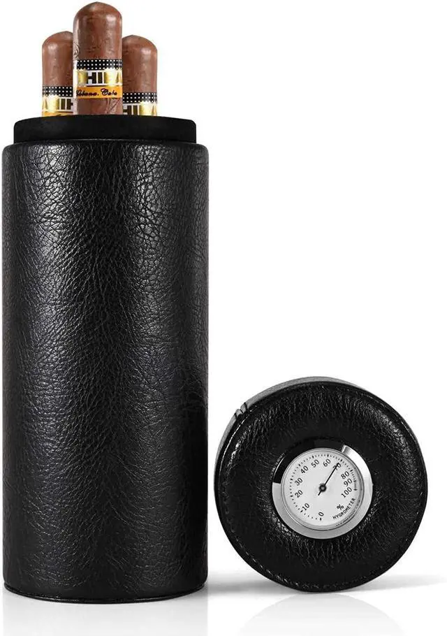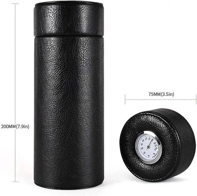 Wrapped with black soft leather lined with cedar interior. On the top of the humidor is a built-in hygrometer shows you the humidity inside of the case. This cigar humidor is equipped with an analog hygrometer, which users can calibrate it by adjusting the screw.