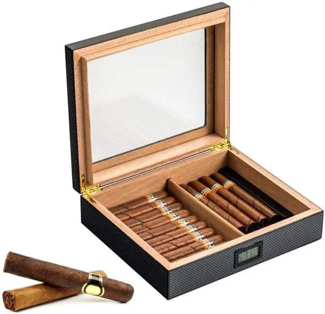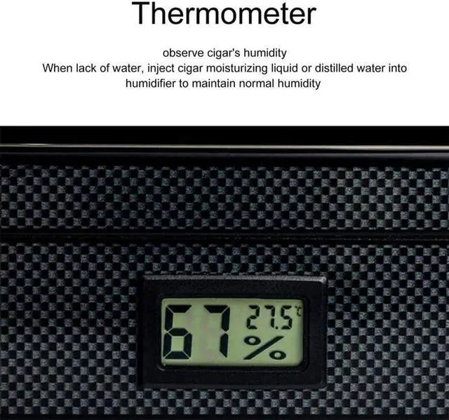 Hygrometer & Humidifier - Built-in hygrometer to observe the cigar's mellow humidity in the box. When moisture is lacking, pour cigar moisturizing liquid or distilled water into the humidifier to maintain the humidity in the box.