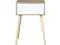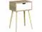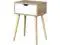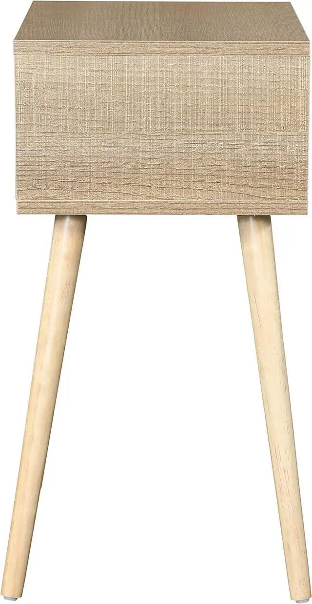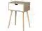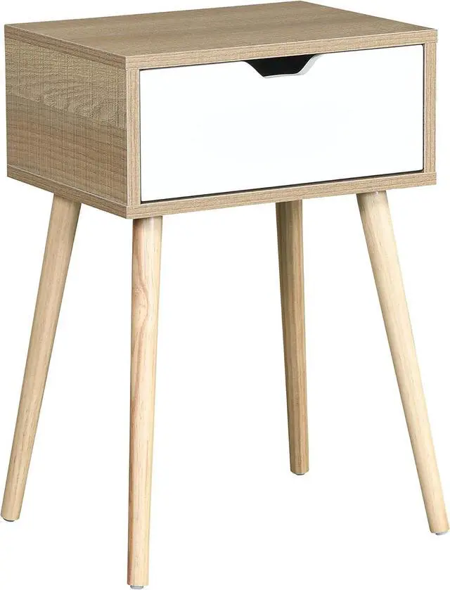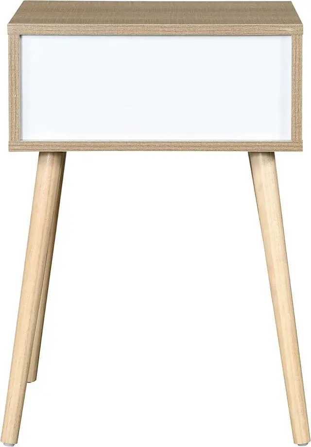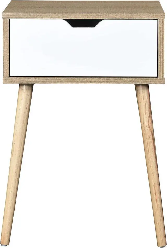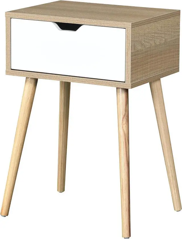Side Table with 1 Drawer and Rubber Wood Legs, Mid-Century Modern Storage Cabinet for Bedroom Living Room Furniture, White with solid wood color.