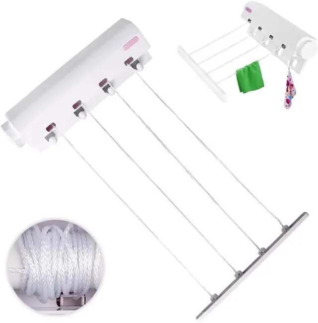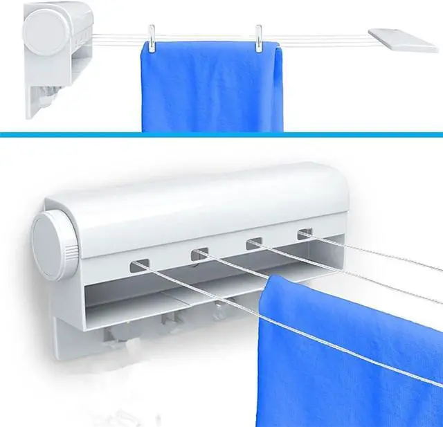 Space-saving compact pull-out clothes line. Steady and taut4-wired Smooth pull-out system and automatic blocking ensures the lines are always taut. Easy to fix between two walls. Maximum length of each line: 3.2m