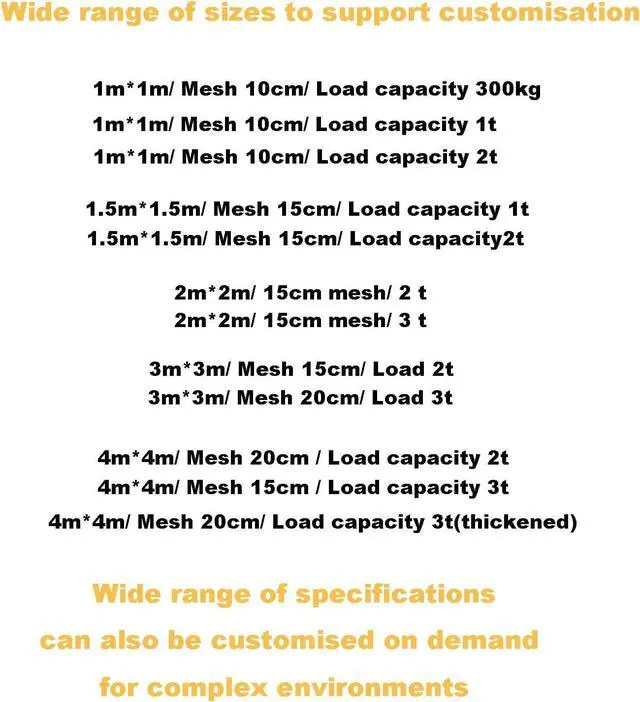 Hello, I'm Netting, welcome to my store! The flat net is made of high-strength polyester webbing, with strong tensile strength, wear-resistant, sun-resistant and weather-resistant, long service life, with the advantages of strong wrapping and large surface area for lifting goods, it is a good helper for your handling! ?Specification: Product Name: Hanging Lifting net Material: Polyester Size: Length x Width (1mx1m, 1.5mx1.5m, 2mx2m, x, 4mx4m) Mesh width: 10/15/20cm Load capacity: 300Kg, 1t, 2t,3t ?Features: - Nylon hanging nets can be customized according to customer's requirements for various specifications of nylon hanging nets, small hole nylon hanging nets, non-hole nylon hanging nets - The high toughness lifting net has the ability to resist stretching and tearing, you can load tie down, pallet lifting, crane use. - Cargo net is made of nylon material, can be used for a variety of purposes. For example, if you have small children, you can put this net on the second and first floor to prevent falls. - Not only for small children, it can also be used as a fence net on stairs, , construction sites, construction sites, blowing outs, condos verandas, etc Package includes: 1* Hanging Lifting net ? Service: - If You Do Not Receive The Goods Normally Or Have Any Questions, Please Contact Us In Time. We Will Reply You Within 24 s. We recommend two things to keep in mind when using lifting nets. One is to avoid sharp implements cutting or slicing the material of the net pocket. The second is to avoid net pockets being connected to other equipment and objects that may pull down the crane. Note: Hanging Lifting net is handmade, there will be a slight error of 1-3CM, but it will not affect the use. Due to the difference in lighting and screen settings, the color of this item may be slightly different from the picture.