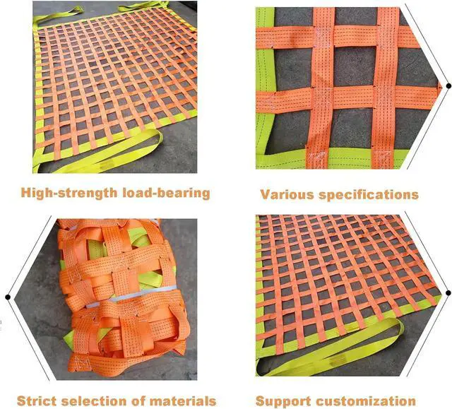 Cargo Net Features - The flat belt sling net is flexible, tough, resistant to stamping, light weight, higher flatness, the sling is made by hand, stronger and more able, it can also be made into a sling net with very small lifting holes.