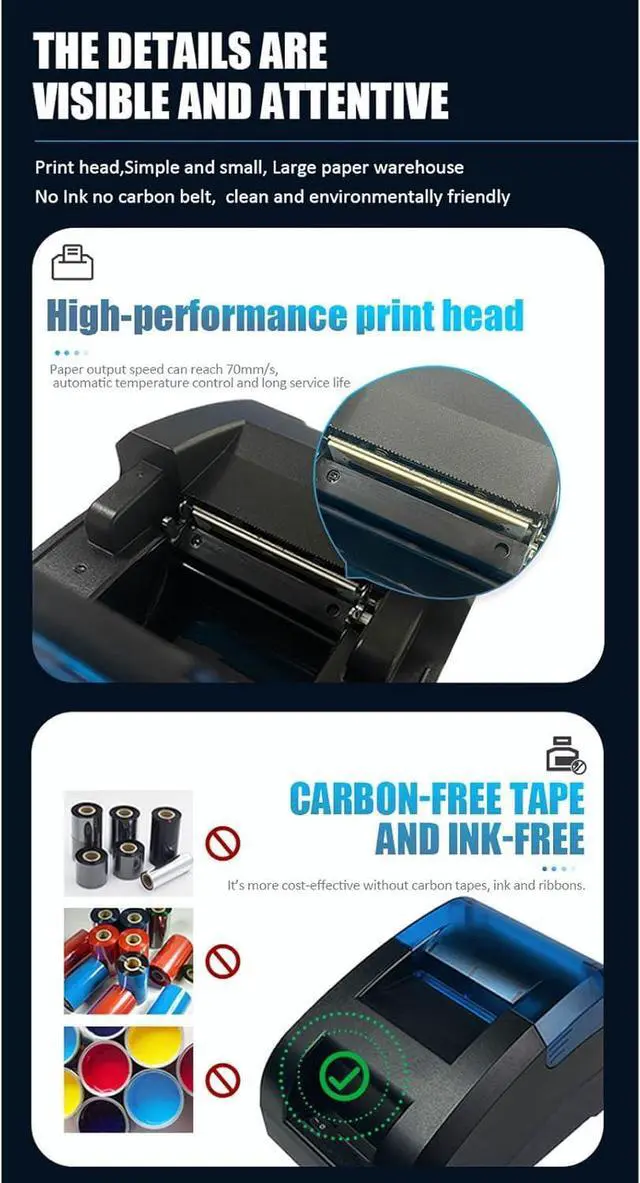 Inkless Operating: No need for carbon ribbons, ink, or ribbons, this thermal printer promotes a green and sustainable approach with its automatic temperature control and long lifespan.