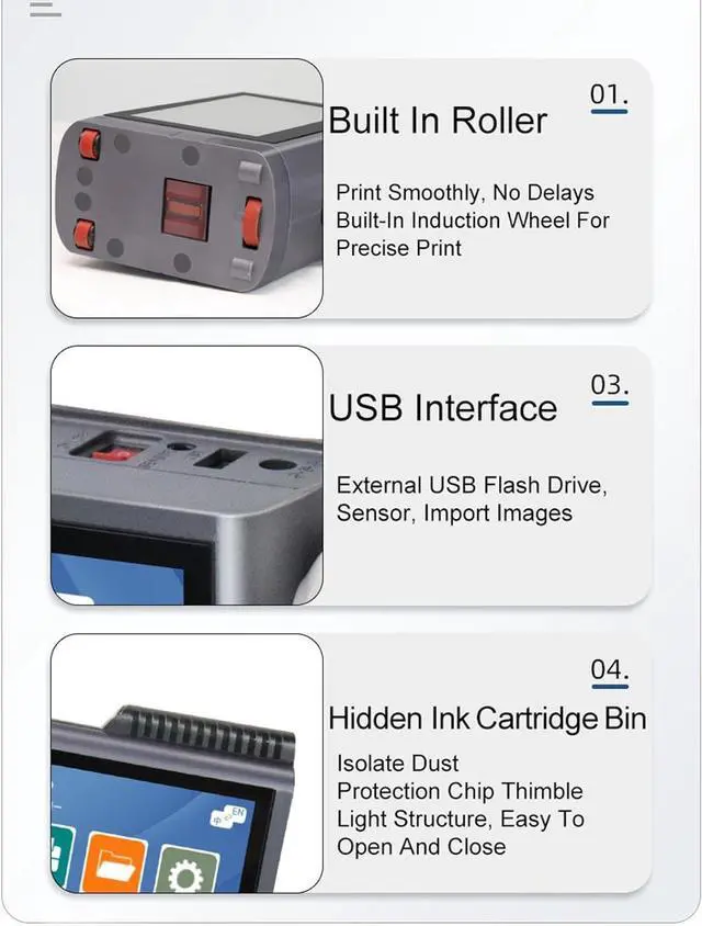 [User Friendly Operating System] The handheld inkjet printer features a built in machine os with an intuitive interface that mimics a smartphone for seamless navigation. integrated electronic encoders ensure smooth performance and support remote upgrades keeping your device up to date with the latest features. the ergonomic handle design reduces hand fatigue during extended use making it ideal for high volume printing tasks.