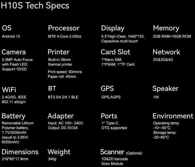 Powerful System and CPU: This PDA printer uses the Android 13 system and is equipped with an MTK 4-Core 2.0Ghz CPU, providing strong running support for Android-based applications and meeting various printing needs.