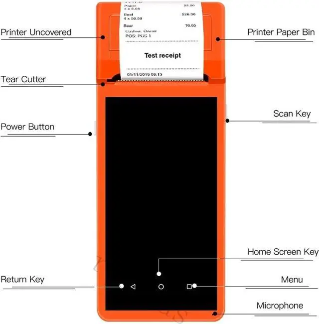 1. Color:Blue / Orange (optional)3. Configuration: 3GCommunication+Camera .4. CPU: Quad-Core 1.3GHz MT6580V/WA5.RAM: 1GB6.NAND Flash: 8GB7. Operating System: Android 8.18. Primary Screen:5.5 Inch, 1280*720 IPS Screen Capacitive Touchscreen9. Communication Method: 3G (fits all kinds of networks)10. Back Camera: 800W Downward Compatible11. Battery:7.4V, 5000mAh12. Charging Interface: DC Charge, 12V 1.5A13. Earphone Interface: 3.5mm Standard Earphones14. OTG: Support15. USB Interface: Micro USB2.0 * 116. Audio System: Built-in Speaker, Buzzer, Microphone17. WiFi: 802.11b/g/n18. GSM: GSM850/900/1800/190019. WCDMA: B120.BT: Bluetooth 4.021. Printing: Therminal Pinter, Paper Scroll 58*35 (not included)22. Printer Size: 21.5 * 8.6 * 5.3cm / 8.46 * 3.39 * 2.1in23. Printer Weight: 462g / 16.3oz24. Package Size: 24.5 * 13.3 * 9cm / 9.65 * 5.24 * 3.54in25. Package Weight: 850g / 29.98ozPacking list:1 * PDA Printer1 * Charger Adapter1 * User Manual (English&Chinese