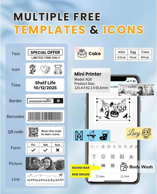 for creating professional clothing labels, warehouse barcode stickers, or kitchen storage with its portable and app