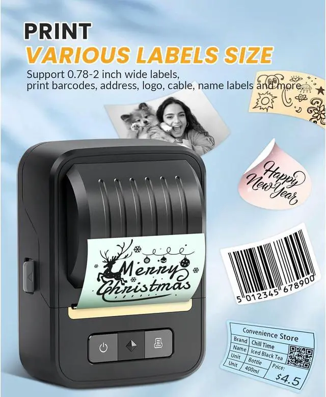 This label maker features thermals printing systems for 3/4" 2" labels, paireds with app providing 40 fonts, 450+, and batches printing capabilities for streamlined workflows