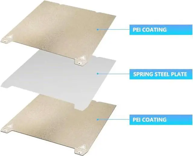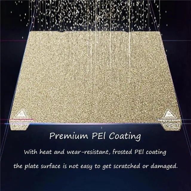 Premium Texture PEl : The PEI coating is evenly attached to the spring steel to ensure the flatness of the platform. The PEI coating also ensures that printing problems such as edge warping and non-sticking of the model will not easily occur during the printing process. At the same time, you can obtain a Matte textured first layer.
