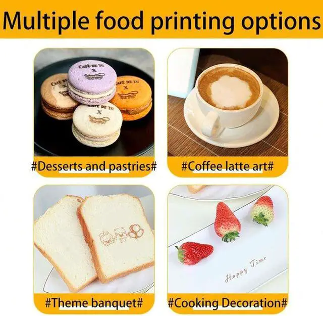 Multi-scenario application Solid items: biscuits, bread and cakes, rice balls, poached eggs, etc., whose surfaces do not come into direct contact with water; Liquid products: Coffee has milk foam, beer has bubbles, yogurt, milk caps, etc. have thick surfaces. Catering: Plates, napkins, tissues, etc. can all be printed. They can be washed off when they get wet.