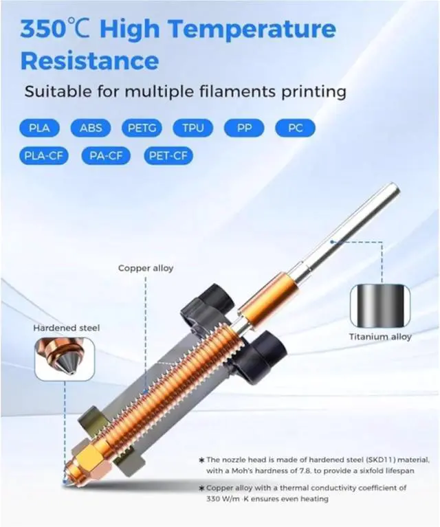 Upgraded Material:The heat break is made of titanium alloy, which reduces heat conduction The nozzle is composed of copper alloy and hardened steel, supporting the printing of various filaments such as PLA ABS PETG TPU PP PC PLA-CF PA-CF PET-CF.