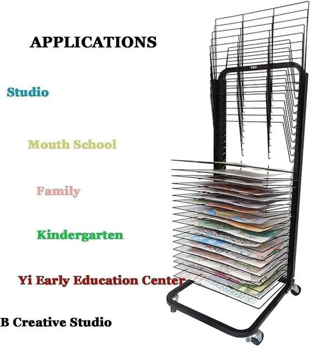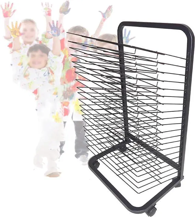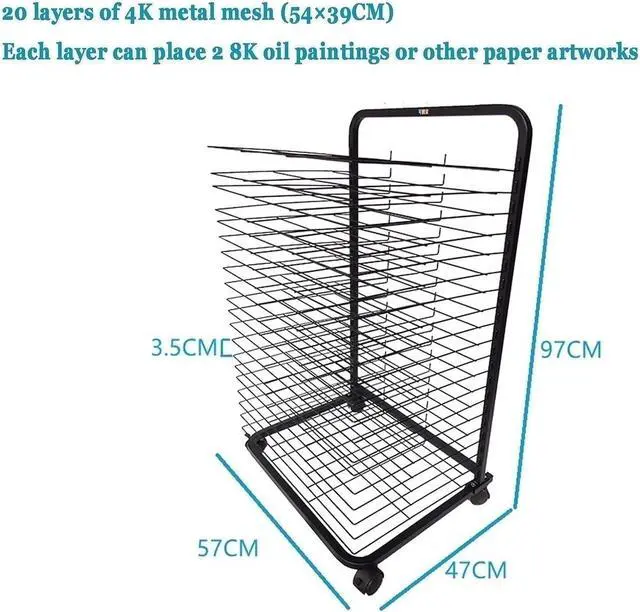 The 20-Layer Art Drying Rack is the ultimate solution for organizing and drying paintings, posters, and prints in classrooms, studios, and homes. Crafted from powder-coated metal wire, this rack can hold up to 75 pounds, offering a and sturdy design for daily use. With 20 layers of shelves, each providing 2.5-3.5 cm spacing, this rack is perfect for drying watercolors, oil paintings, and standard posters. Its compact height of 78/97 cm makes it ideal for use in both art classrooms and creative studios. The four mobile casters provide ease of movement, allowing you to roll the rack to any location and lock it into place when needed. Easy to assemble and maintain, this drying rack includes assembly instructions and tools, and can be cleaned effortlessly with a damp cloth. Perfect for organizing artwork and ensuring proper drying without the worry of smudging or damage.