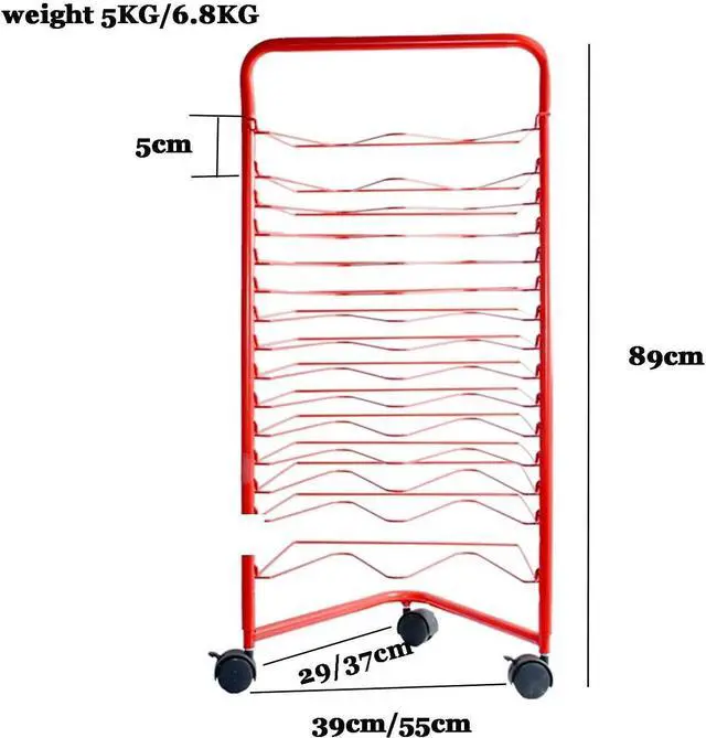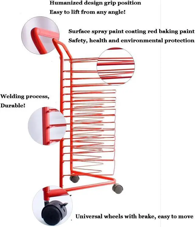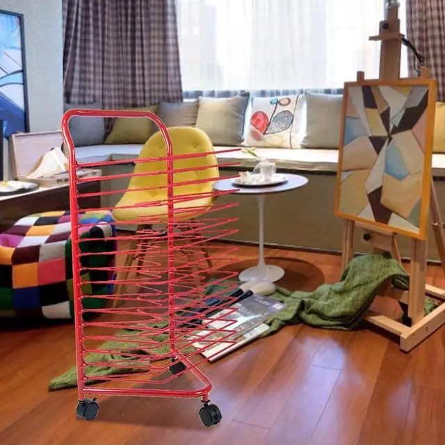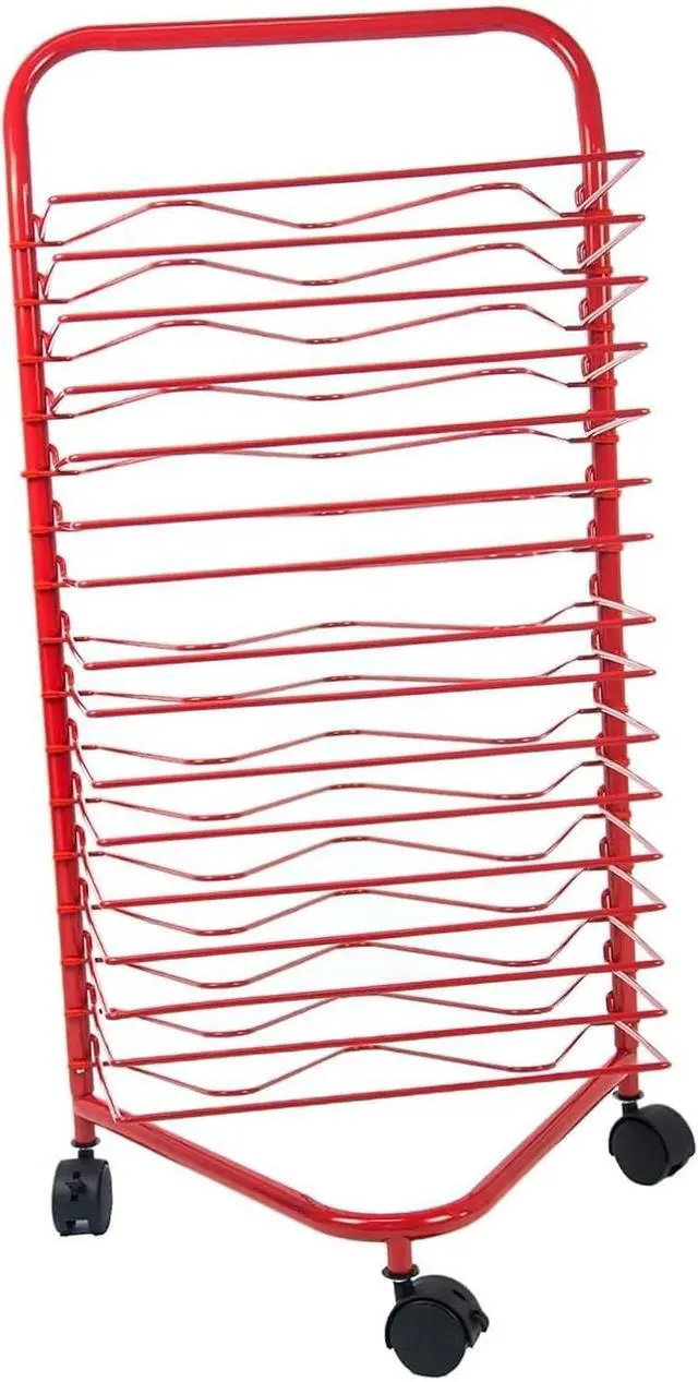 This 16-tier silk screen artwork drying rack is perfect for art studios, classrooms, kindergartens, and childcare centers. Made from sturdy powder-coated metal wire, it supports up to 75 pounds and offers ample space with shelves spaced 5cm apart for drying small sheets, posters, watercolor papers, and prints. The rack stands 89cm tall and is equipped with 3 smooth casters for easy mobility and space-saving storage. Assembly is quick and with included tools and instructions. Its vibrant red color adds a bright touch to any creative space, making it both functional and visually appealing.