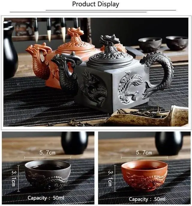 Purple Clay Chinese Tea Set Ceramic Teapot & 4 Tea Cups with Dragon & Phoenix Design Porcelain Tea Service for Home, Office, Gift (Red One Size)