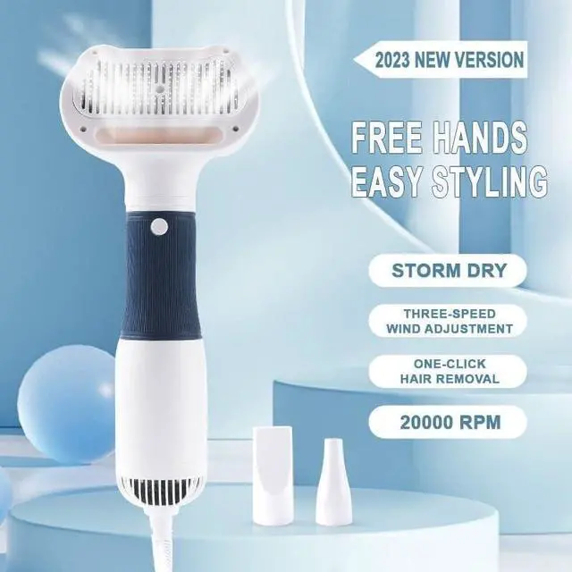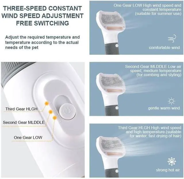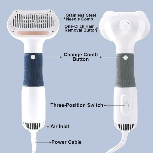 Design: Combines a dog hair dryer, pet hair brush, and slicker brush in one convenient tool, allowing you to dry and groom your pet simultaneously.