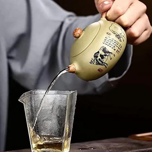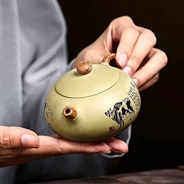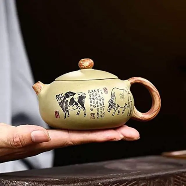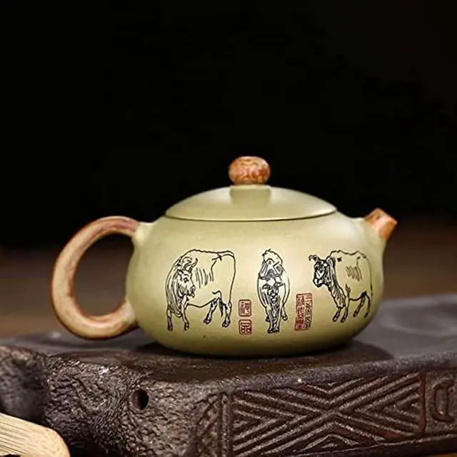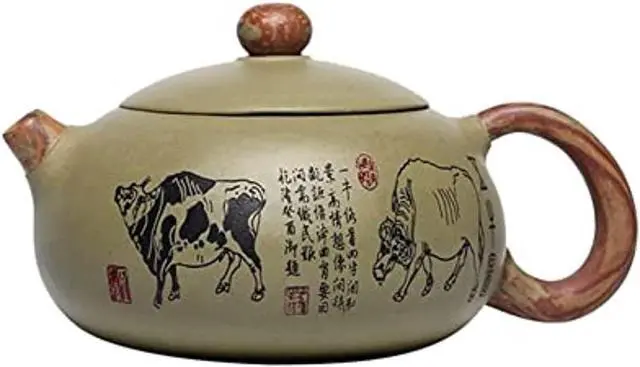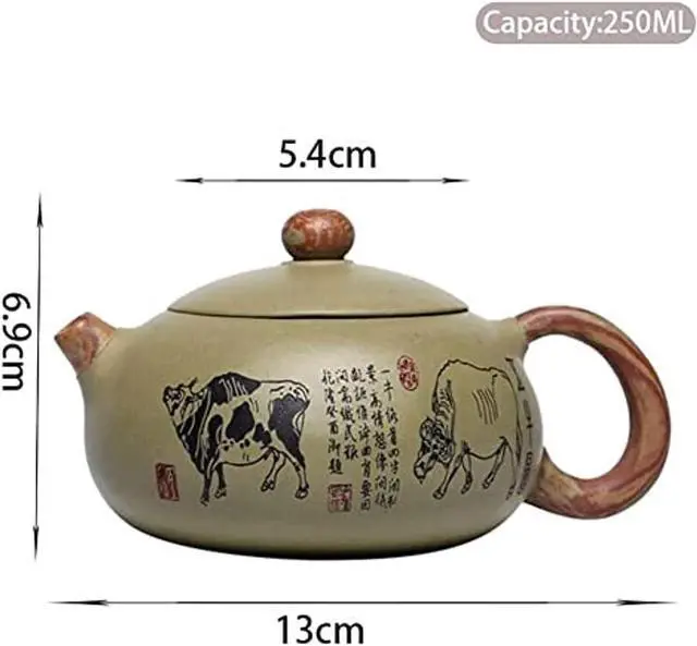 Handmade Zisha Clay Teapot Expertly crafted from raw ore Zisha clay, this 260ml teapot will develop a glossy patina, enhancing its beauty with time. Artistic Five Cow Xishi Design Features a unique hand-painted Five Cow Xishi pattern, showcasing intricate artistry that adds elegance to your tea experience. Mesh Filter for Clean Tea Equipped with a mesh filter, ensuring your tea remains free of l
