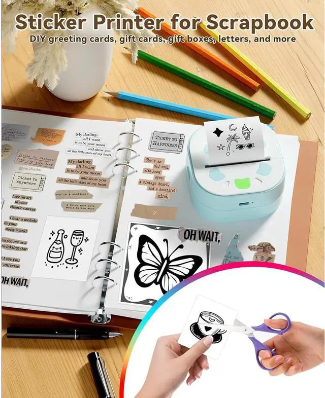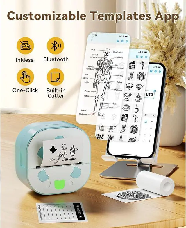 Create stickers instantly with Printpods miniature Sticker Printer, featuring connectivitys, thermals inkless technology, and pre loaded templates for designs on phones/tablets.