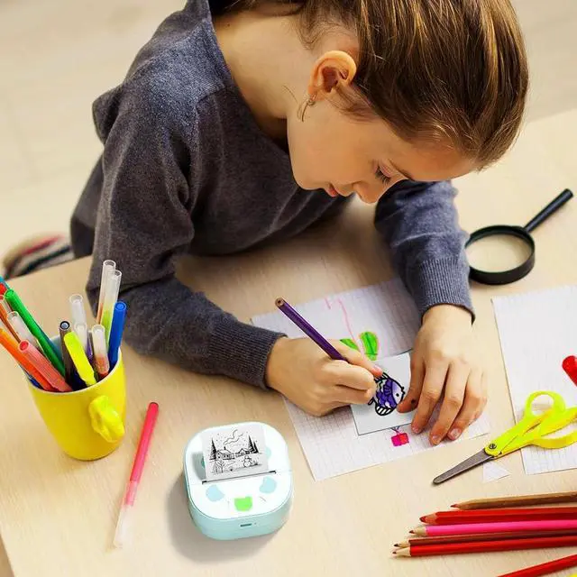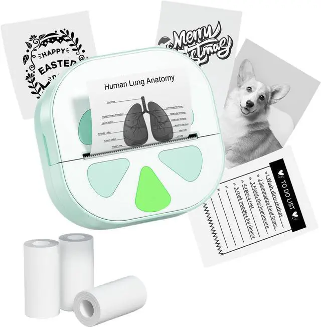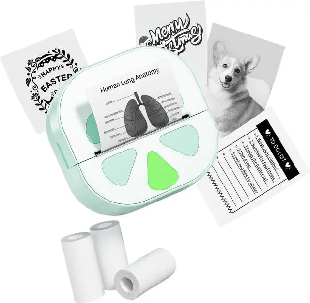This portable thermals printer use 57mm adhesive paper (3 rolls included), supports colored/transparents sheets, and operates without inks via heat sensitive technology.