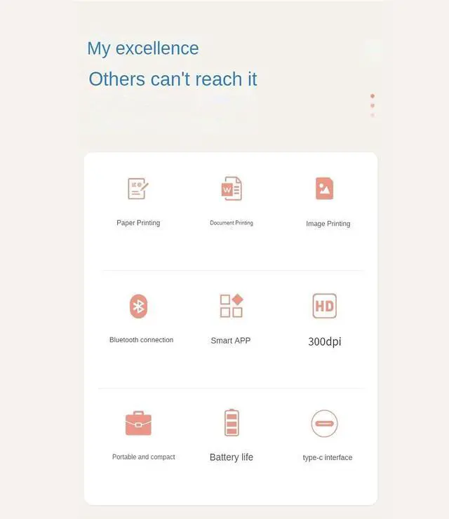 DesignThe small and portable design of this printer makes it easy to put in your backpack or bag, so you can print documents anytime, anywhere. Stable life, built-in large-capacity , you don't have to worry about running out of power when you go out.(without cartridge)