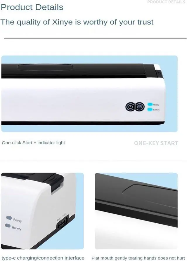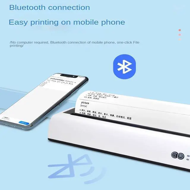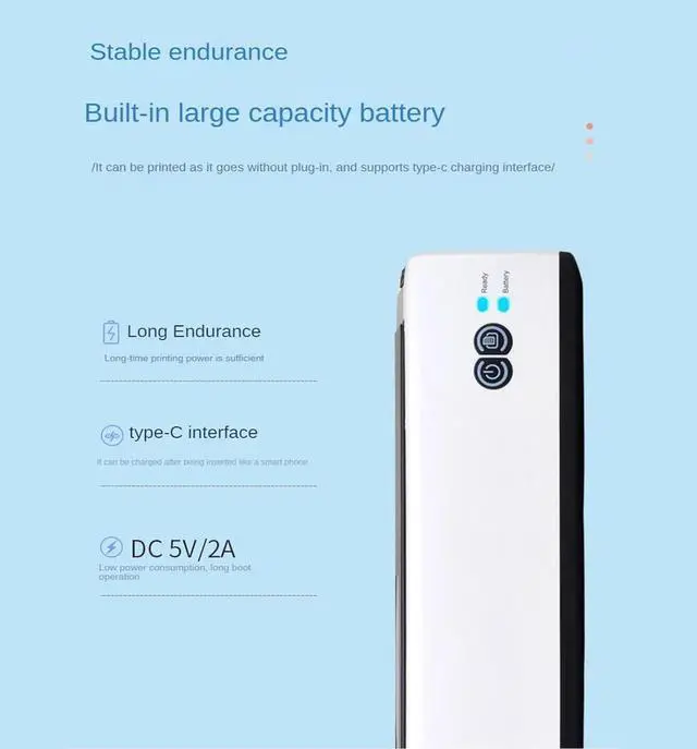 Simple The portable Bluetooth printer supports type-c charging interface, DC 5V/2A low power consumption, and can be turned on for a long time. It's easy to use, with one-button start and a light to let you know when it's ready to print. The printer is also designed to accommodate A4 paper size with a print width of 216 mm.
