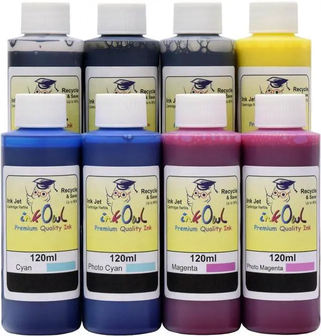 Comes with 8x120ml bottles of premium Ink Owl pigment-based ink. Ink Owl ink is produced in the USA. This is not a cheap Chinese dye ink, it is a color-matched, pigment-based replacement of the original. There is no need to purge the printer when switching from original inks.